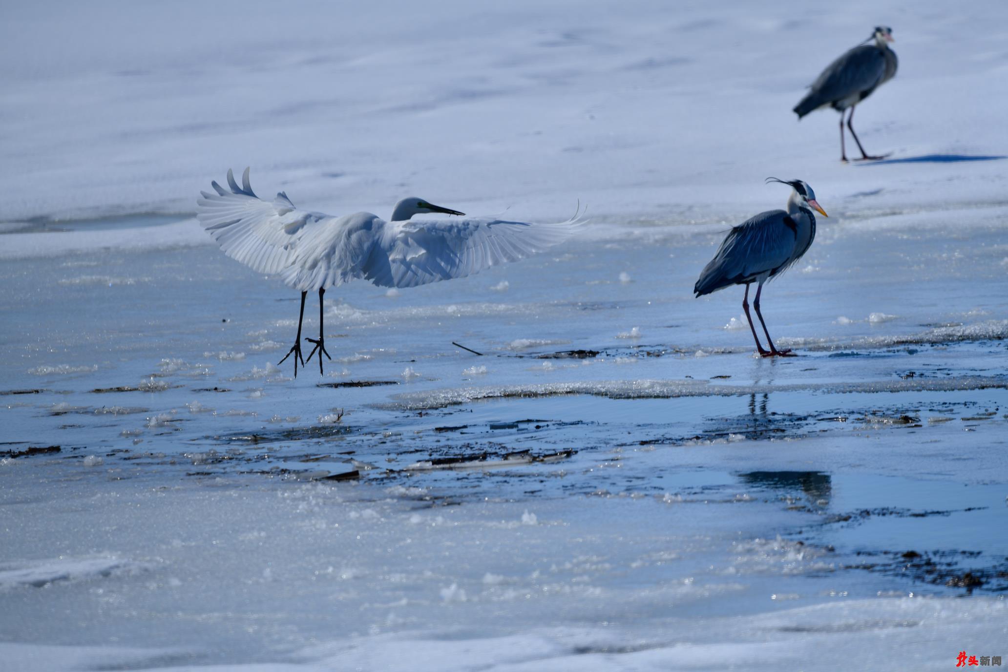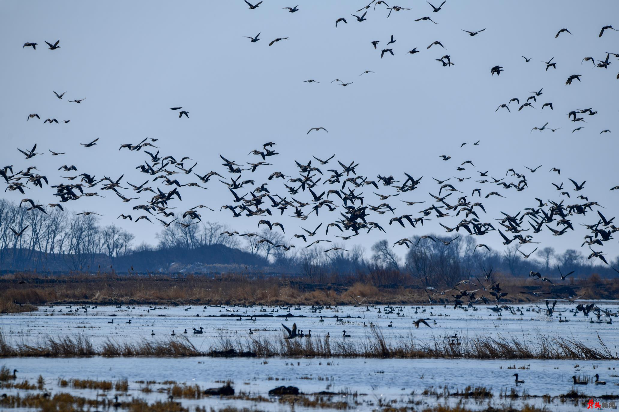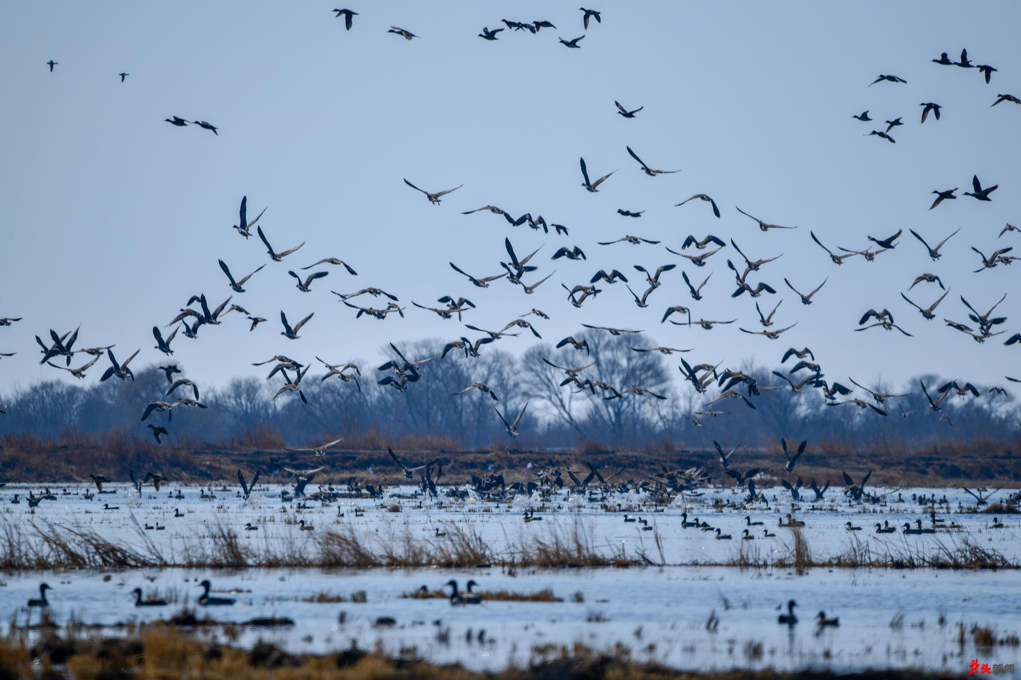 候鳥(niǎo)們有的聚集在剛剛化凍的湖邊,有的聚集在興凱湖閘門(mén)流水口附近的活水中,更多的則群集在興凱湖附近的水田地或沼澤地里。