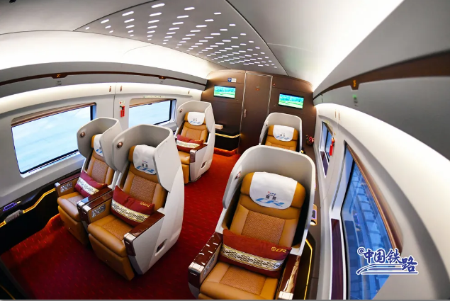 全列覆蓋免費高速Wi-Fi,旅客在旅行途中可以隨時使用電腦辦公、手機娛樂。車廂內(nèi)設有大件行李存放處、無障礙衛(wèi)生間等設施,并在殘疾人座位區(qū)配備輪椅固定裝置、SOS按鈕等。