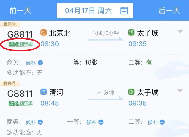 △在12306上購買京張高鐵車票時,該車型車次下方會有綠色“智能動車組”字樣
