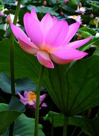 荷葉蓋很大,呈圓盾形,邊緣起伏如波狀隨風搖擺,姿態(tài)很優(yōu)美。從各個角度可以看到葉蓋正、側、反、卷、垂的狀態(tài)。葉蓋的葉脈俗稱葉筋,從葉蓋的臍眼向四周放射性伸展,極有規(guī)律。