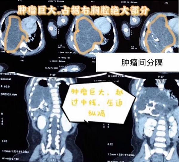 一周前,小彤彤因?yàn)闅獯⒑粑щy、惡心在當(dāng)?shù)蒯t(yī)院就診,胸片檢查提示隔膨升可能,為了明確診斷來到哈爾濱市兒童醫(yī)院心胸外科就診。戚家峰副主任為孩子進(jìn)一步進(jìn)行查體考慮是縱隔腫瘤,通過胸部CT增強(qiáng)造影檢查更加清晰的看到腫瘤的特殊性,該腫瘤幾乎占滿右側(cè)胸腔,縱隔被擠壓后導(dǎo)致移位,心臟、食管均有不同程度的受壓影響。而且這個(gè)巨大的腫瘤由很多分隔組成,分隔中含有的物質(zhì)又不同,有囊性組織、實(shí)性組織和鈣化組織,考慮畸胎瘤可能。