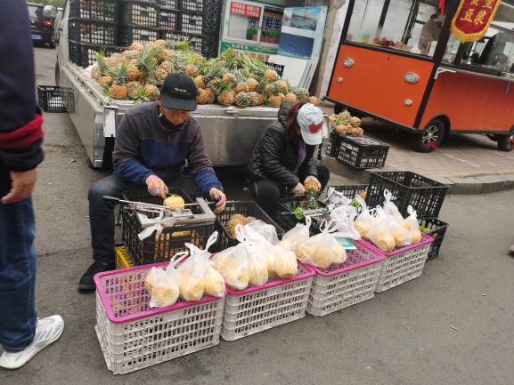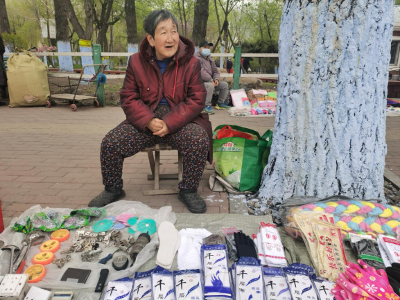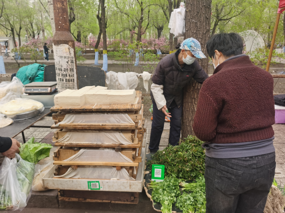 早市的吸引力在于“看”。早市上,各攤主會(huì)想各種各樣的方式招攬顧客,有的會(huì)用廣告牌,有的會(huì)吆喝。早市上的商業(yè)運(yùn)作方式也非常有趣,比如現(xiàn)場(chǎng)擠羊奶,旁邊拴幾頭奶羊,當(dāng)招牌;賣刀切面的現(xiàn)場(chǎng)切,炸油條的現(xiàn)場(chǎng)炸,都是明檔手工,這幾乎是大多數(shù)早市商家的促銷手段。也有推銷老花鏡的,賣衣服的,會(huì)現(xiàn)場(chǎng)吆喝“正宗商品專柜,清倉促銷”——這大概是現(xiàn)在“直播帶貨”的線下模式。住在早市附近的居民,有的會(huì)在樓上用繩子吊下個(gè)籃子,讓攤主把東西放到籃子里,直接拽上去。