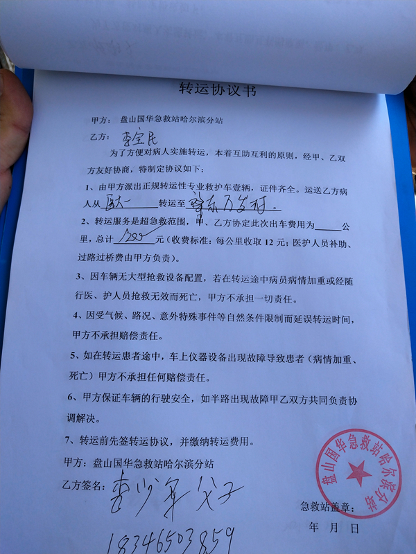 記者詢問了其中一名駕駛員車輛的相關手續(xù)和單位的資質(zhì),對方表示不清楚,他們只是司機,負責開車,一個月工資3000元錢,公司指派去哪接人送到哪,他們就按照指示去做。記者又問到:你們是怎么收費的?最遠去到哪?車上有沒有醫(yī)護人員?對方說最遠就是呼蘭,沒出過哈市,收費就是按照公里數(shù)收費。隨后工作人員在車里找到了轉運協(xié)議書,其中一張顯示車輛從醫(yī)大一院轉運至肇東市,收取費用是1200元(收費標準:每公里收取12元,醫(yī)護人員補助、過路過橋費由甲方負責)。針對此情況,由于不確定車輛是否具備營運資質(zhì),需要和遼寧還有患者家屬方面核實,所以將車輛的相關證件暫扣。