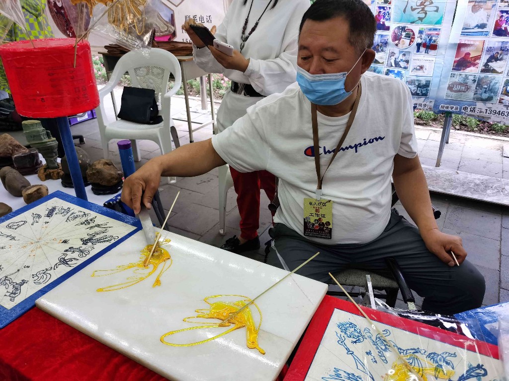 距離魁氏燒鍋釀造技藝展柜還有一段距離,就能聞到濃郁甘醇的酒香,流水宴賓朋的造型吸引了一大批酒文化愛(ài)好者駐足;姚氏糖畫技藝展柜旁,圍了不少小朋友和“大朋友”,“我小時(shí)候特別迷牡丹江市愛(ài)民區(qū)兒童公園旁邊賣的糖畫,每次路過(guò)都央求爸爸給我買個(gè)‘龍’,活靈活現(xiàn)的!”市民回憶說(shuō)。