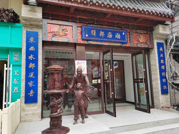 來(lái)到位于解放路的渤海郵驛主題郵局,古香古色的門(mén)頭下,是身著清代服飾的祖孫倆正在向郵筒里投遞信件的場(chǎng)景雕塑。