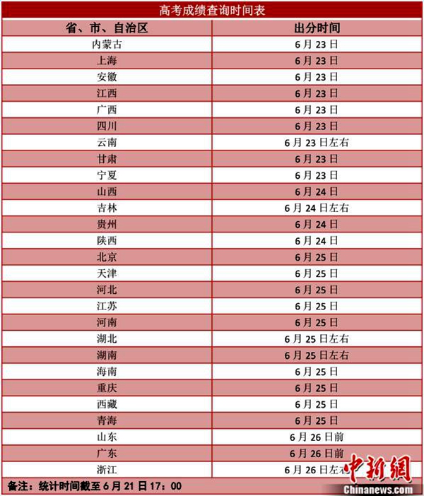 根據(jù)各省份此前公布的時間,6月23日起各地將陸續(xù)公布高考成績,查分時間主要集中在23至26日。