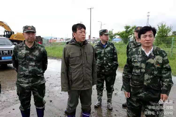 塔河林業(yè)局黨委書記許曉光、局長趙鐵軍同大興安嶺林業(yè)集團(tuán)公司黨委書記于輝實(shí)地查看塔河污水處理廠西側(cè)的洪水引流現(xiàn)場