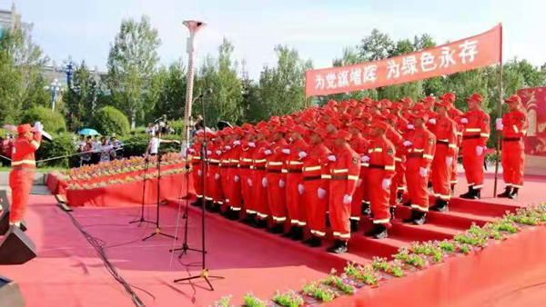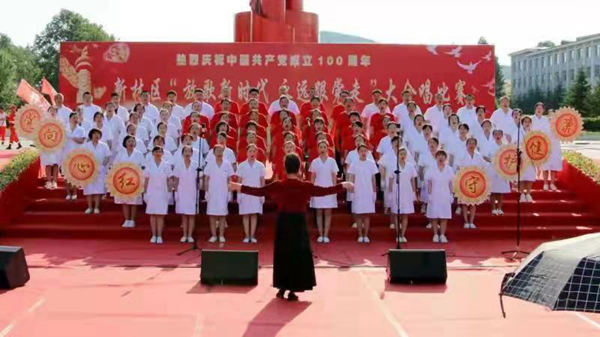 新林林業(yè)局機(jī)關(guān)黨委為現(xiàn)場(chǎng)觀眾展演《沒有共產(chǎn)黨就沒有新中國》《歌唱祖國》。大合唱現(xiàn)場(chǎng)舉行了黨旗傳遞活動(dòng),巨幅黨旗經(jīng)過新林區(qū)局黨員干部職工緩緩傳遞。