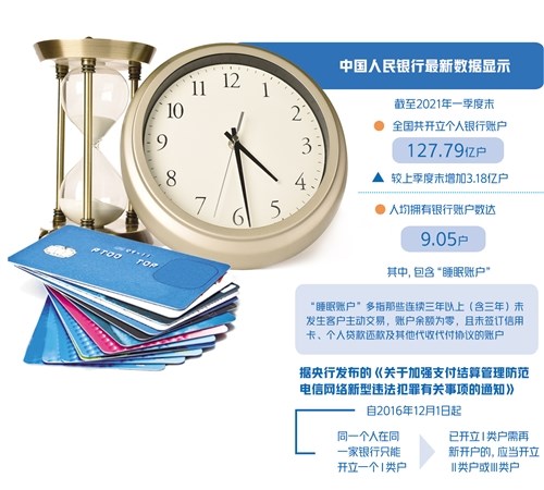 中國(guó)人民銀行最新數(shù)據(jù)顯示,截至2021年一季度末,全國(guó)共開立個(gè)人銀行賬戶127.79億戶,較上季度末增加3.18億戶,人均擁有銀行賬戶數(shù)達(dá)9.05戶。