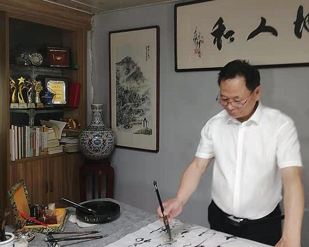 他每年向社會(huì)團(tuán)體贈(zèng)送書法作品百幅,內(nèi)容健康,有古詩詞、五字言、七字言、有毛澤東詩詞等,為弘揚(yáng)民族文化精神而努力。