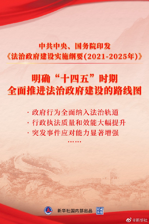 中共中央、國務(wù)院近日印發(fā)的《法治政府建設(shè)實(shí)施綱要(2021——2025年)》確立了今后五年法治政府建設(shè)的總體目標(biāo),明確到2025年,政府行為要全面納入法治軌道。綱要還提出,著力實(shí)現(xiàn)行政執(zhí)法水平普遍提升,努力讓人民群眾在每一個執(zhí)法行為中都能看到風(fēng)清氣正、從每一項(xiàng)執(zhí)法決定中都能感受到公平正義。(新華社記者白陽 海報(bào)設(shè)計(jì)楊軼群)