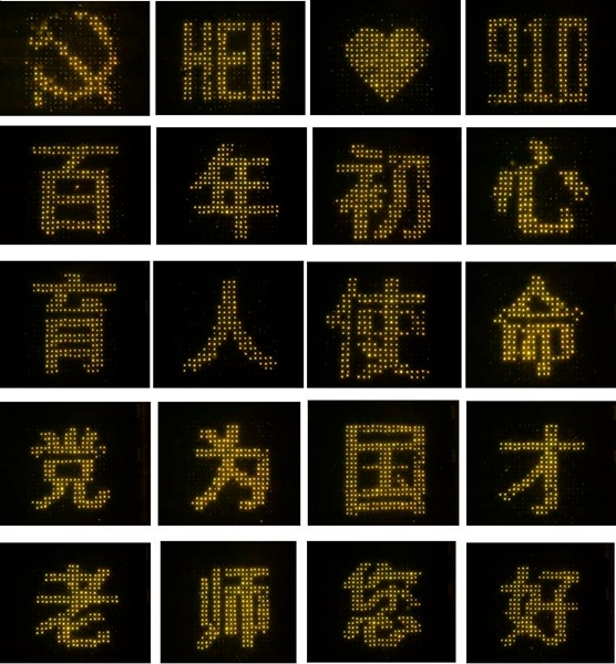 黨徽、HEU(哈工程縮寫(xiě))、愛(ài)心、9.10、百年初心、育人使命、為黨育人、為國(guó)育才、老師您好……同學(xué)們匯聚力量共同拼出了24組圖案和字樣,即使天空飄起毛毛細(xì)雨,他們也絲毫沒(méi)有變換位置,在雨中足足站了兩個(gè)小時(shí)。2021級(jí)博士生王文軒感慨:“作為一名本、碩都就讀于哈工程的學(xué)生,這所大學(xué)的老師教會(huì)了我如何做人做事做學(xué)問(wèn),我們用這場(chǎng)燈光秀,獻(xiàn)禮我們最尊敬的老師,我們也一定會(huì)傳承哈軍工精神,勇?lián)鷱?qiáng)國(guó)百年使命擔(dān)當(dāng)?!?/span>