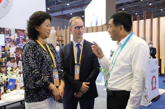 李軍、陳昱兩位集團(tuán)公司領(lǐng)導(dǎo)走進(jìn)北極冰藍(lán)莓酒莊設(shè)立在法國FIWA的站臺(tái),向FIWA國際大獎(jiǎng)賽主席、法國國際品評(píng)鑒定酒類專家協(xié)會(huì)主席奧利維耶·布什,以及法國FIWA SAS股份有限公司總裁張莉推介了參展的藍(lán)莓冰酒、藍(lán)莓雪酒等產(chǎn)品在剛剛結(jié)束的義烏森博會(huì)受到客戶青睞情況,尤其是重點(diǎn)介紹了大興安嶺地處祖國最北方,日照時(shí)間長(zhǎng),晝夜溫差大,天然純降水,生長(zhǎng)出野生藍(lán)莓具有花青素含量高的特點(diǎn),其產(chǎn)品藍(lán)莓冰酒、藍(lán)莓白蘭地等在法國國際葡萄酒大獎(jiǎng)賽、有機(jī)葡萄酒大獎(jiǎng)賽和烈酒大獎(jiǎng)賽上斬獲大金獎(jiǎng)、金獎(jiǎng)。