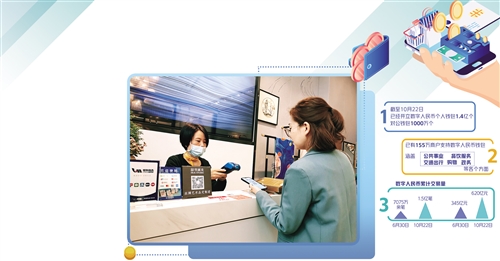 線下場景日益多元的同時(shí),數(shù)字人民幣交易場景也正在發(fā)力線上,形成了“線上+線下”并行推廣的格局。現(xiàn)在,數(shù)字人民幣已經(jīng)可以在京東、美團(tuán)、滴滴等多個(gè)線上場景使用。截至10月22日,已有155萬商戶支持?jǐn)?shù)字人民幣錢包,涵蓋公共事業(yè)、餐飲服務(wù)、交通出行、購物和政務(wù)等各個(gè)方面。