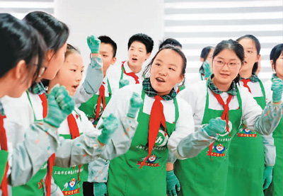 上海華東師范大學附屬進華中學綠色農(nóng)藝社團的學生在“屋頂生態(tài)園”表演節(jié)目。新華社記者 劉穎攝