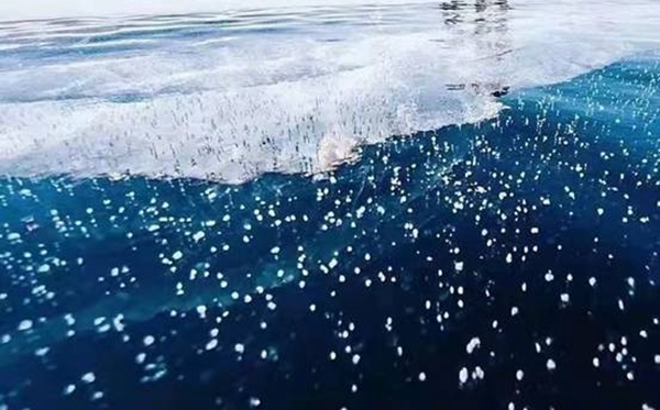 “冰泡”是由湖底植物釋放出的沼氣(甲烷)在上升過程中,因極寒氣溫導致冰封速度過快,被“鎖”在冰層之中而形成。目前,全世界僅有3個著名的冰泡湖,北極漠河冰泡湖是中國最北唯一的“冰泡奇觀”。觀音山“冰泡”晶瑩剔透、造型奇特、惟妙惟肖,有的形似“飛碟”一飛沖天,有的形似“珊瑚”美輪美奐,有的形似“觀音”端坐蓮臺。形態(tài)各異的“冰泡”形成一幅幅精美的冰雪藝術畫卷,成為漠河冬季最火爆的網紅打卡地。