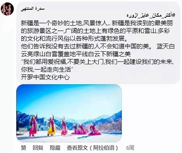 其中,來自埃及曼蘇拉的西德拉·蒙塔哈獲得本次活動(dòng)的“最佳評(píng)論獎(jiǎng)”。她在中心帖文下多次留言,“新疆風(fēng)景迷人,是最美的旅游勝地之一。在廣袤的土地上有草原和雪山,沒有去過新疆的人,就不會(huì)知道中國的美……我想去那里滑雪、騎馬?!绷硗猓€想去北京吃炸醬面,去遼寧泡溫泉等。