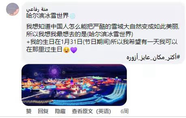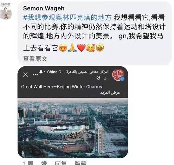 2022年年初,根據(jù)埃及社會(huì)、文化特點(diǎn)和民眾喜好,開羅中國文化中心創(chuàng)新推出了2022“北方冰雪旅游海外推廣季”之“我最想去的地方”線上評(píng)選活動(dòng),邀請(qǐng)埃及各界友人參與話題互動(dòng),在中心主題帖文下寫出自己最想去的中國省份(或城市)及原因,曬出旅游目的地圖片并打上話題標(biāo)簽等。活動(dòng)一經(jīng)推出,即受到埃及民眾的廣泛關(guān)注,網(wǎng)友們紛紛在中心臉書帖文下留言并轉(zhuǎn)發(fā),評(píng)選自己“最想去的中國冰雪旅游勝地”,并熱情附上自己之前在華留學(xué)、訪問、旅游、生活的旅游體驗(yàn)和文化閱歷,活動(dòng)二次外溢效應(yīng)明顯,二次傳播效果良好,旅游推廣和文化傳播的效果遠(yuǎn)遠(yuǎn)高于預(yù)期?;顒?dòng)期間,該活動(dòng)