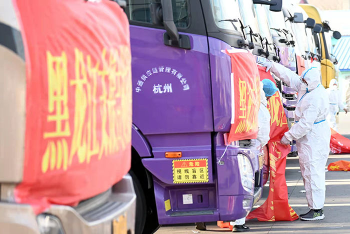 為了保障此次物資運(yùn)送順利、安全,所有車輛及人員全部實(shí)行閉環(huán)管理,途中不經(jīng)過市區(qū),安排警車引導(dǎo),運(yùn)送物資車輛原則上直接抵達(dá)吉林省外接卸點(diǎn),不與吉林省工作人員直接接觸,無接觸傳遞完成物資交接后,立即對(duì)車輛進(jìn)行全面消毒。