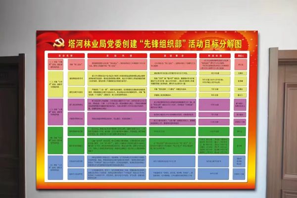 掛圖“作戰(zhàn)”,統(tǒng)籌指導。塔河林業(yè)局黨委組織部結(jié)合自身實際制定了《塔河林業(yè)局黨委創(chuàng)建“先鋒組織部”實施方案》;緊緊圍繞集團黨委下發(fā)方案中的“五大”活動和九項具體工作內(nèi)容制定目標分解展示圖,詳細列出了活動內(nèi)容、活動要求、完成時限,秉承誰具體負責,誰統(tǒng)籌推進,誰跟蹤問效的的原則,將責任落實到人頭,時刻督促每名組工干部及時完成目標任務,凝心聚力,共同打造講政治、重公道、業(yè)務精、作風好的組工干部隊伍。