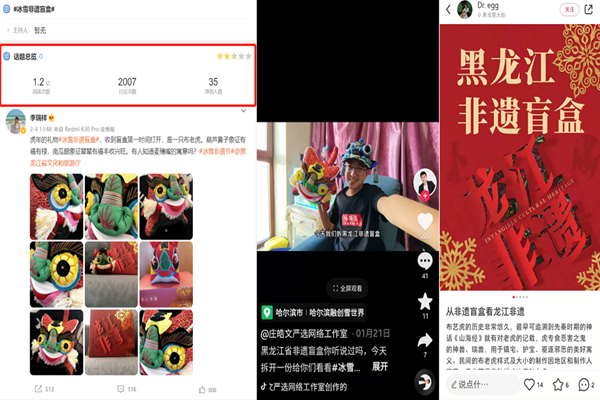 “黑龍江冰雪非遺盲盒”是省文旅廳在第二屆冰雪非遺節(jié)期間,依托黑龍江省豐富的非物質(zhì)文化遺產(chǎn)資源,推出的創(chuàng)意營(yíng)銷(xiāo)活動(dòng)?;顒?dòng)期間,甄選了陳氏布藝、樺樹(shù)皮畫(huà)、剪紙、鰉魚(yú)等黑龍江非遺產(chǎn)品,涵蓋了藝術(shù)品、美食等多種品類,通過(guò)官方微博及微信公眾平臺(tái)策劃線上招募“非遺體驗(yàn)官”、非遺問(wèn)答游戲等多種形式活動(dòng),隨機(jī)發(fā)放盲盒,充分展示了龍江非遺的獨(dú)特魅力。