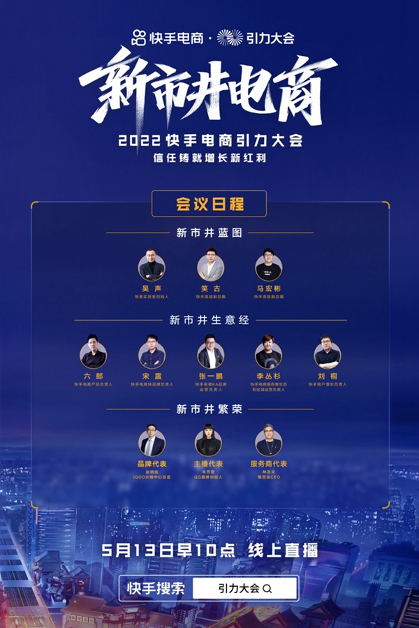 2022年快手電商引力大會于5月13日上午10點(diǎn)在北京舉行。2022快手電商引力大會議程包括新市井藍(lán)圖、新市井生意經(jīng)、新市井繁榮三大篇章。