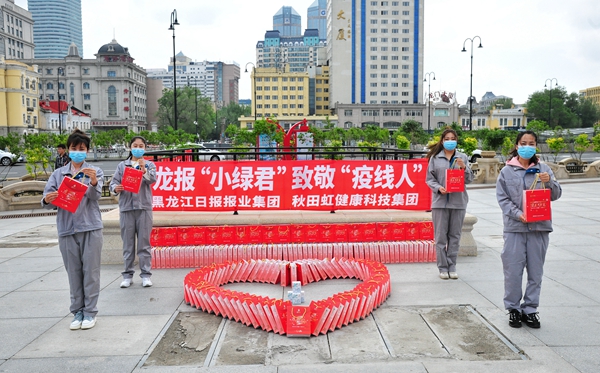 5月27日,由黑龍江日報報業(yè)集團和哈爾濱秋田虹健康科技集團共同發(fā)起的“龍報‘小綠君’,致敬‘疫線人’”系列公益活動,在哈爾濱火車站南廣場正式啟動。黑龍江日報報業(yè)集團、哈爾濱市委宣傳部、哈爾濱市公安局巡特警支隊、哈爾濱秋田虹健康科技集團領(lǐng)導出席啟動儀式。