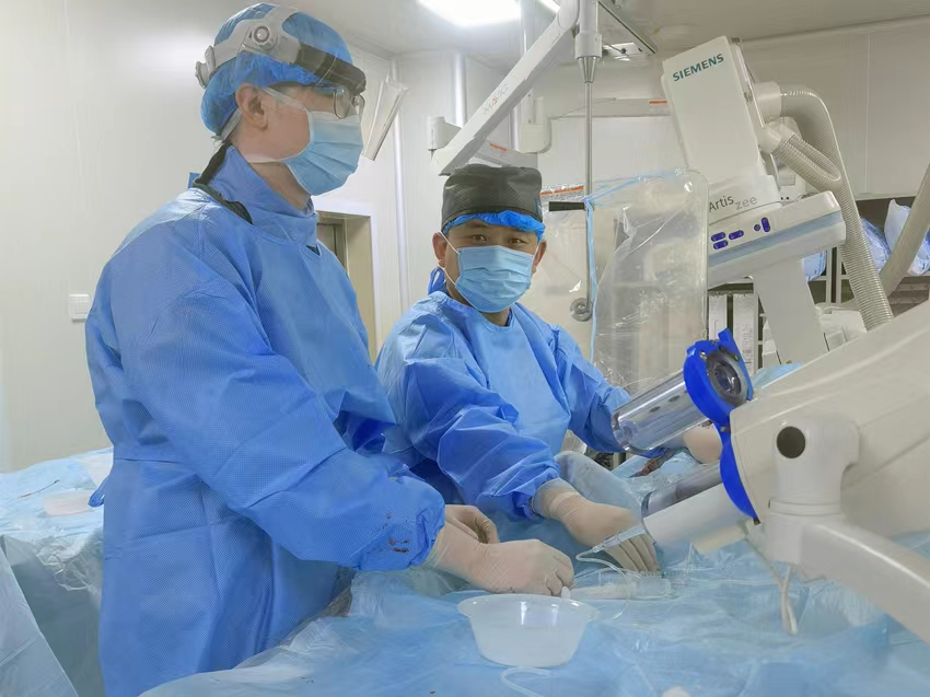 “患者入院后雖進(jìn)行了快速靜脈溶栓,但病情依然進(jìn)展性加重,我們發(fā)現(xiàn)患者病情為顱內(nèi)主干血管閉塞導(dǎo)致,情況十分危急,如果不及時(shí)介入開通閉塞的顱內(nèi)大血管,一旦錯過治療最佳時(shí)機(jī),患者就可能會出現(xiàn)危及性命等情況?!泵F副主任醫(yī)師回憶了當(dāng)時(shí)搶救情景。搶救刻不容緩,在爭得家屬同意并簽字后,神經(jīng)介入團(tuán)隊(duì)立即將張先生送至導(dǎo)管室進(jìn)行介入取栓治療。