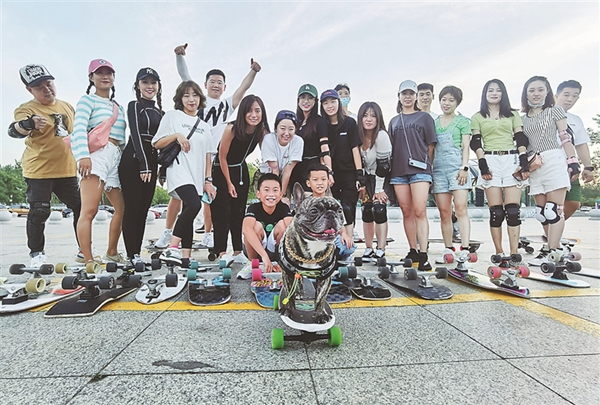 7月21日18時許,太陽島地鐵站出口附近的小廣場,一群人抱著陸沖板陸續(xù)趕到,其中“80后”“90后”居多,還有帶孩子來的“寶媽”。不少人來的時候穿著上班的職業(yè)裝,換上圓領(lǐng)T恤,戴上鴨舌帽,配齊護具,簡單熱身后,迫不及待地開滑。