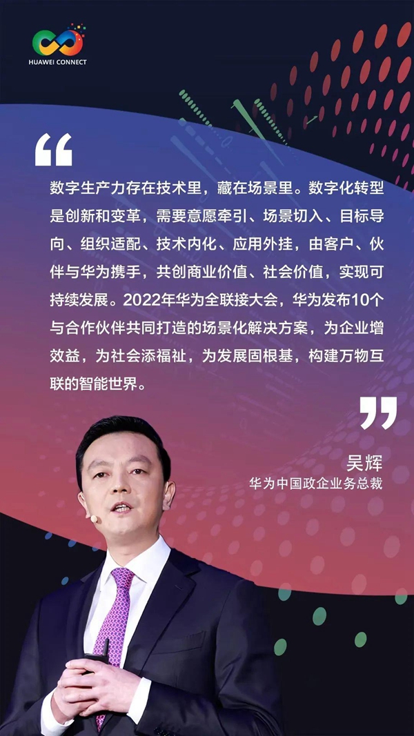 當(dāng)前,我國的數(shù)字化已經(jīng)進(jìn)入快車道,釋放數(shù)字生產(chǎn)力正當(dāng)其時(shí)。而“數(shù)字生產(chǎn)力就存在技術(shù)里,藏在場景里?!被诖耍A為中國政企業(yè)務(wù)總裁吳輝在會上發(fā)表了題為《為行業(yè)找技術(shù),深入場景創(chuàng)造價(jià)值》的主題演講,重點(diǎn)分享了華為基于多年的探索和實(shí)踐總結(jié)出的行業(yè)數(shù)字化轉(zhuǎn)型的方法論和企業(yè)轉(zhuǎn)型成功秘訣。