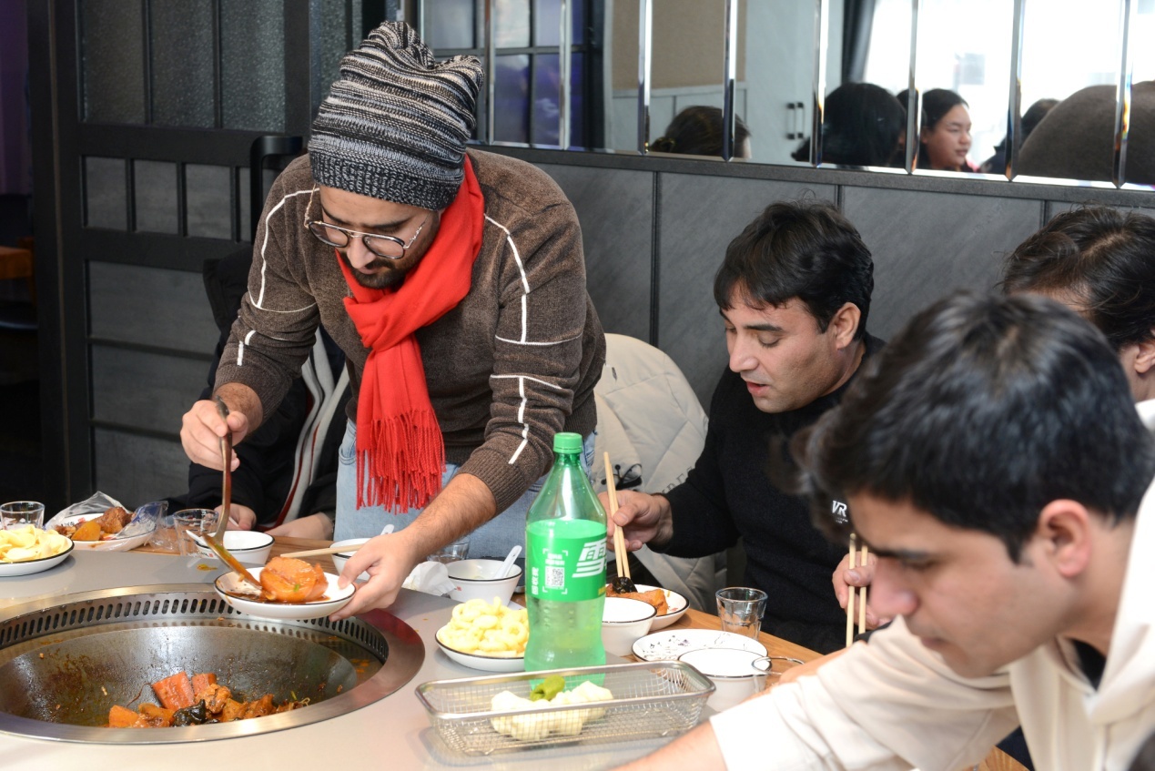 中午,留學(xué)生們品嘗了東北特色美食“鐵鍋燉”——鐵鍋燉大鵝、燉排骨,東北特色鍋包肉、拔絲地瓜讓留學(xué)生們感受了中華美食的魅力,大家紛紛贊嘆中華美食文化的博大精深,雖然遠(yuǎn)離家鄉(xiāng),卻在熱氣騰騰的美食中感受到家的溫暖。品味美食的過程中,有的留學(xué)生穿上東北特色大花襖,有的穿上中國(guó)傳統(tǒng)服飾雪披風(fēng),系上花圍巾,大家喜不勝收,將中國(guó)元素展示給世界。