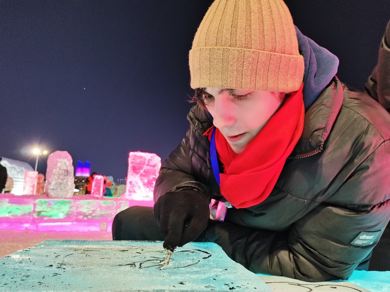 傍晚,中外青少年在流光溢彩、美輪美奐的哈爾濱冰雪大世界中感知冰雪藝術(shù)的魅力。在冰雪藝術(shù)體驗(yàn)營(yíng)聆聽冰雕制作過程,學(xué)習(xí)將冰與中國(guó)傳統(tǒng)木刻版畫相結(jié)合,親手設(shè)計(jì)制作屬于自己獨(dú)一無二的冰版畫,體驗(yàn)冰雪帶來的樂趣。