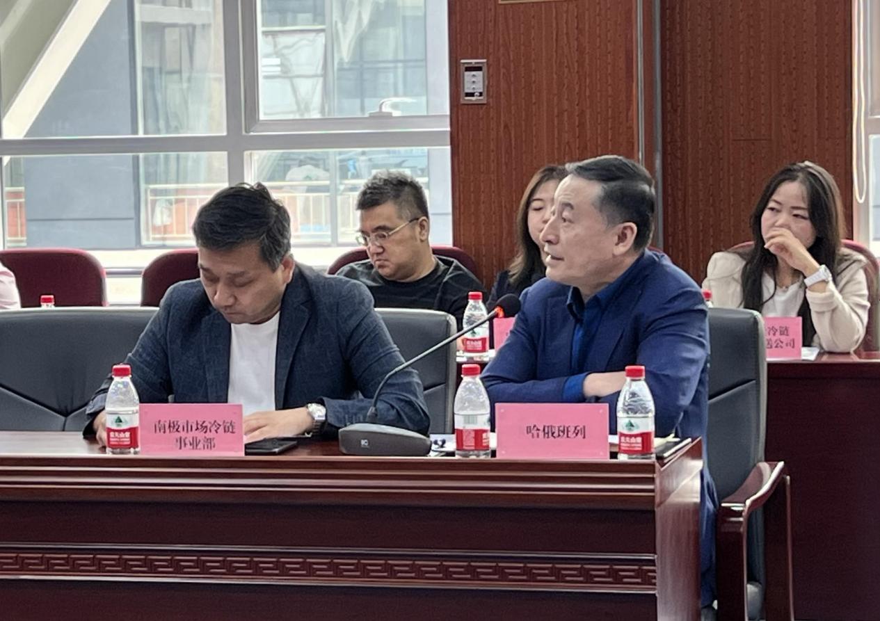 會上,哈俄班列運營公司總經(jīng)理樊繼忠介紹了哈俄班列冷鏈項目現(xiàn)狀及發(fā)展思路;冰城海關(guān)駐香坊辦事處、市商務(wù)局對俄貿(mào)易處、哈綜保區(qū)管委會、哈爾濱銀行等相關(guān)負(fù)責(zé)人分別就冷鏈海鮮進(jìn)口報關(guān)查驗情況、俄羅斯冷凍海鮮陸運物流解決方案、發(fā)展冷鏈業(yè)務(wù)基礎(chǔ)設(shè)施條件及相關(guān)政策、冷鏈物流倉儲加工優(yōu)勢、國際結(jié)算情況等問題進(jìn)行詳細(xì)介紹,并現(xiàn)場為參會企業(yè)答疑解惑。