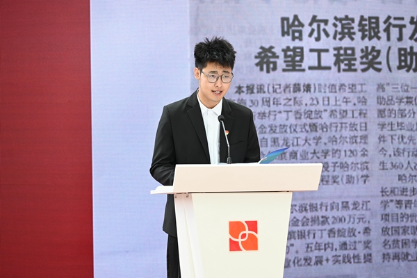 來(lái)自哈爾濱理工大學(xué)的獲獎(jiǎng)學(xué)生程同學(xué)代表全體獲獎(jiǎng)學(xué)生向共青團(tuán)、希望工程、哈爾濱銀行表示感謝,并表達(dá)了自己在課業(yè)之余會(huì)積極參加“丁香綻放·童心港灣”等志愿服務(wù)項(xiàng)目,把公益火種延續(xù)下去。