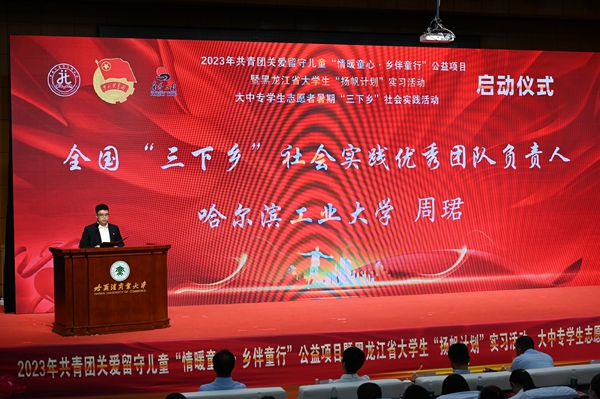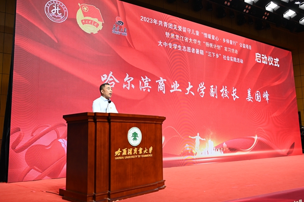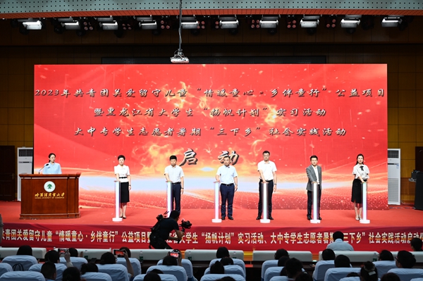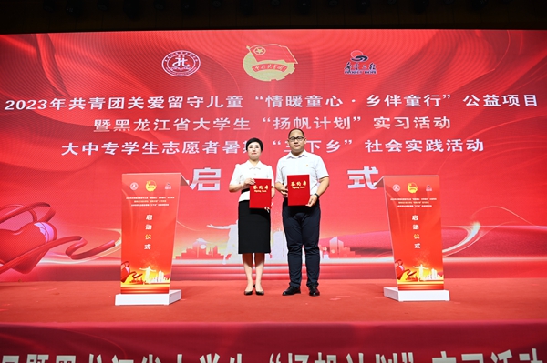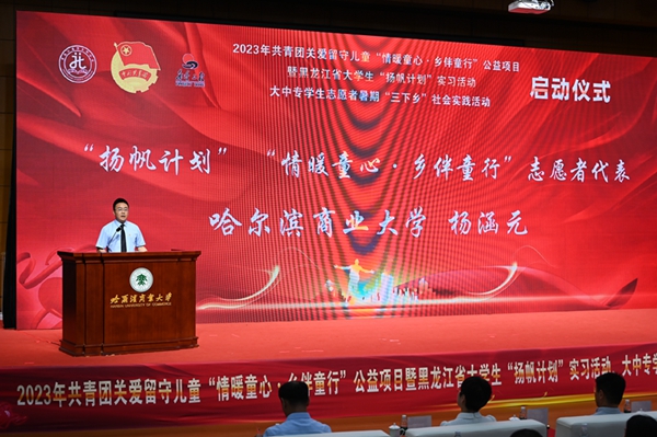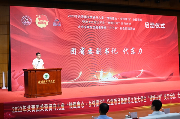黑龍江經(jīng)濟(jì)網(wǎng)訊(王丹陽(yáng) 記者祝東)7月5日,2023年共青團(tuán)關(guān)愛留守兒童“情暖童心·鄉(xiāng)伴童行”公益項(xiàng)目暨黑龍江省大學(xué)生“揚(yáng)帆計(jì)劃”實(shí)習(xí)活動(dòng)、大中專學(xué)生志愿者暑期“三下鄉(xiāng)”社會(huì)實(shí)踐活動(dòng)啟動(dòng)儀式在哈爾濱商業(yè)大學(xué)隆重舉行。共青團(tuán)黑龍江省委副書記代東力、陳海平,哈爾濱商業(yè)大學(xué)副校長(zhǎng)姜國(guó)峰,省直機(jī)關(guān)團(tuán)工委書記趙明瑞,黑龍江省人力資源和社會(huì)保障廳、省知識(shí)產(chǎn)權(quán)局、省人民檢察院、省青少年發(fā)展基金會(huì)、哈爾濱市南崗區(qū)民政局、哈爾濱海關(guān)、哈爾濱海事局相關(guān)領(lǐng)導(dǎo),以及哈爾濱商業(yè)大學(xué)的志愿者和哈爾濱市樂業(yè)小學(xué)師生代表參加本次活動(dòng)。