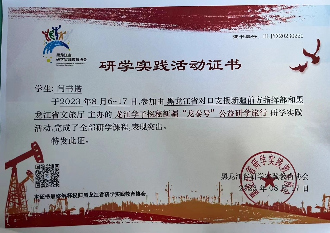 在今年8月,報名參加了黑龍江省對口支援新疆前方指揮部和黑龍江省文旅廳主辦的“探秘新疆公益研學旅行”,到可可托海紅色教育基地實地參觀“三號礦坑”,緬懷那些為國家奉獻出生命的前輩。