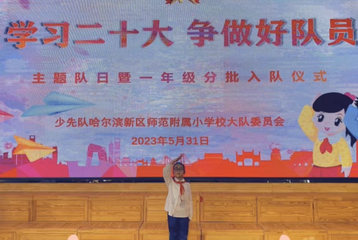 閆書諾同學來自哈爾濱新區(qū)師范附屬小學二年八班,在六一兒童節(jié)前夕,以優(yōu)異的成績成為學校2022級第一批中國少年先鋒隊隊員。