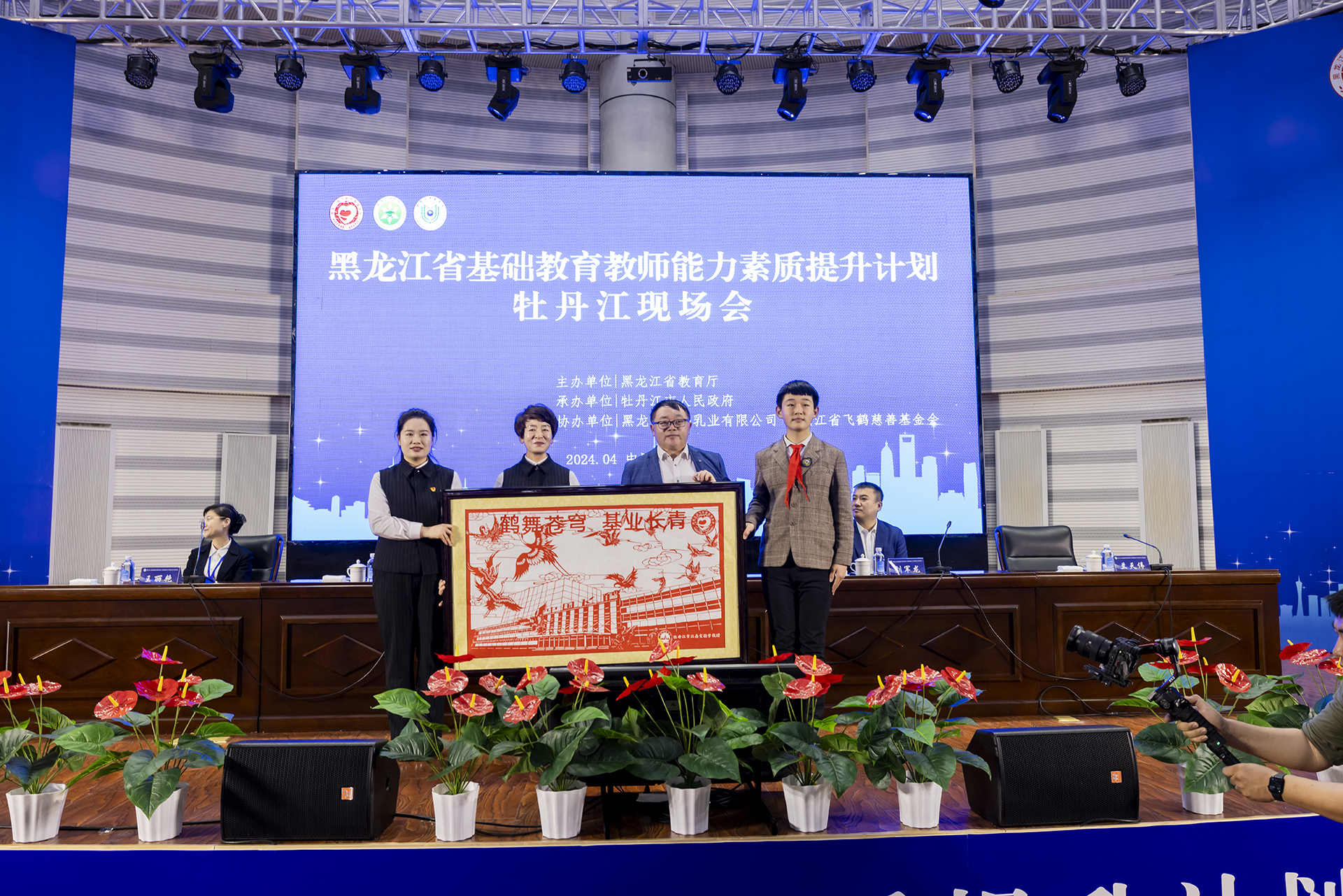 會議現(xiàn)場,牡丹江市江南實(shí)驗(yàn)學(xué)校向中國飛鶴贈送剪紙作品,以表示全省師生對中國飛鶴助力龍江教育公益行動的感謝。