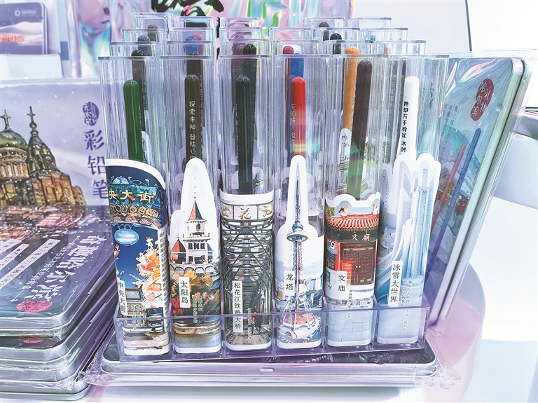 “‘爾濱’爆火,八方客來,除了帶點(diǎn)哈爾濱特產(chǎn),還能帶走啥?我們帶著這些思考,創(chuàng)新設(shè)計(jì)了奇趣哈爾濱—打卡攻略系列產(chǎn)品,涵蓋哈爾濱24個(gè)知名景區(qū)景點(diǎn)。只要用手機(jī)輕觸彩色鉛筆的包裝盒,就能沉浸式游‘爾濱’?!鄙兄臼姓渲楣P業(yè)有限責(zé)任公司市場(chǎng)運(yùn)營(yíng)主管沈瑩介紹,公司生產(chǎn)的全芯無木筆市面稀有,之前一直出口,在歐美國(guó)家熱銷,這兩年參加哈洽會(huì),大受歡迎。彩色鉛筆不僅適合孩子們書寫、繪畫,成人解壓,還可以作為文創(chuàng)產(chǎn)品送人。展品從實(shí)用性上可分為水溶的、油性的、石墨的和碳化的四種,從設(shè)計(jì)上可以分為奇趣哈爾濱系列、奇趣哈爾濱—打卡攻略系列、中國(guó)韻系列和音樂節(jié)系列,可滿足不同人群需求。