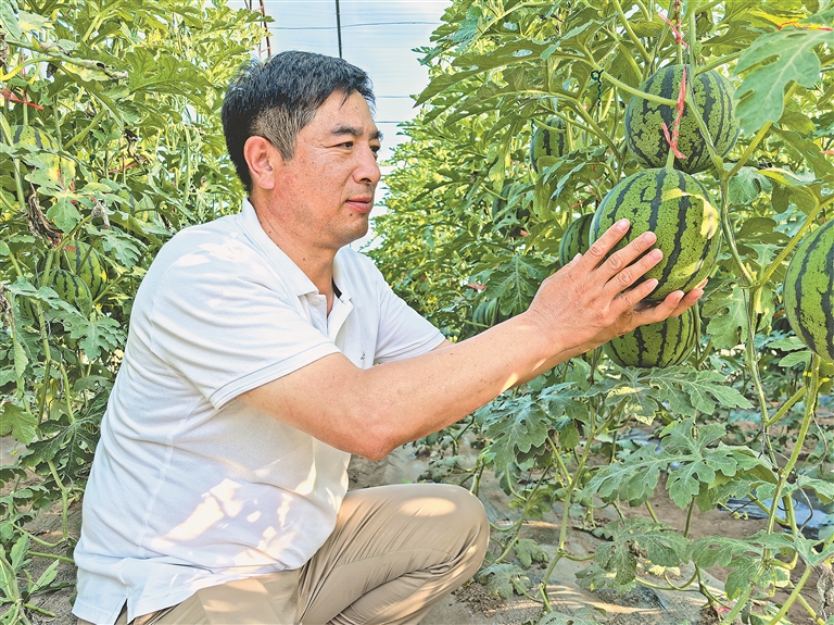 王喜慶在查看西瓜長(zhǎng)勢(shì)。