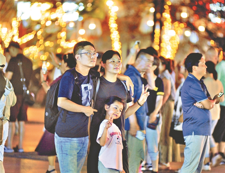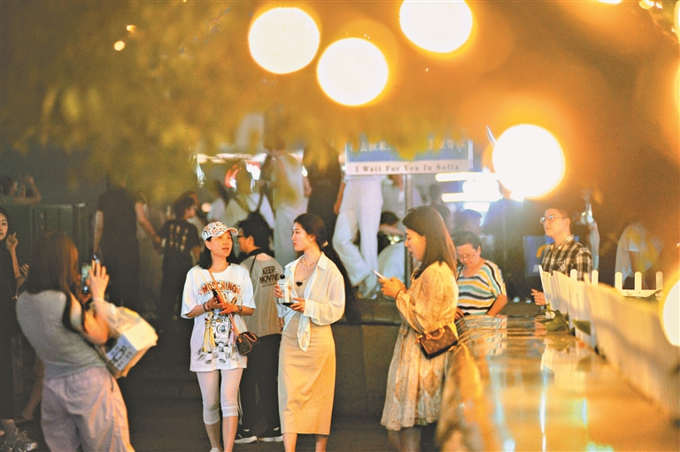 冰城夏夜,涼爽宜人,哈爾濱建筑藝術(shù)廣場上人來人往,非常熱鬧。許多游客在觀賞美景,享受清涼。廣場周邊的樹木、水池等處安裝了美麗的燈飾,夜幕降臨這些彩燈紛紛點(diǎn)亮,勾勒出一個(gè)迷人的夜晚。一位湖南游客說,上午就來參觀過,晚上又來了,很涼快,風(fēng)景也很美,拍攝了很多好看的圖片發(fā)到朋友圈,親友們紛紛點(diǎn)贊。