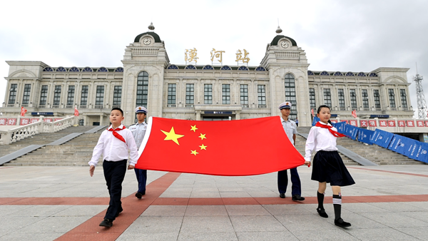 升旗儀式結(jié)束后,少先隊(duì)員現(xiàn)場(chǎng)對(duì)《紅領(lǐng)巾愛祖國(guó)——我心中的五星紅旗》長(zhǎng)卷手繪涂色,將自己心中最美的顏色送給祖國(guó)。在北極鎮(zhèn)七星廣場(chǎng)同步開展了快閃活動(dòng),少先隊(duì)員、合唱團(tuán)和現(xiàn)場(chǎng)群眾共同演唱了《歌唱祖國(guó)》《身在最北方 心向黨中央》等歌曲。