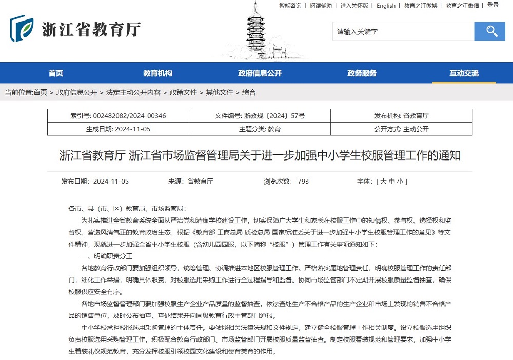 作為服裝產(chǎn)業(yè)發(fā)達省份,浙江省一直注重校服質(zhì)量。如2014年浙江省教育廳聯(lián)合浙江省質(zhì)量技術(shù)監(jiān)督局發(fā)布《關(guān)于進一步加強學(xué)生服裝和床上用品管理工作的通知》;2018年,浙江省質(zhì)監(jiān)局聯(lián)合教育廳、工商局聯(lián)合發(fā)布了《浙江省學(xué)生服質(zhì)量提升行動工作方案》;2022年10月,浙江省《教育收費政策(2022年)》規(guī)定學(xué)校收取服務(wù)性收費和代收費,堅持學(xué)生自愿和非營利原則,不得與學(xué)費、住宿費合并統(tǒng)一收取,不得從中牟利。