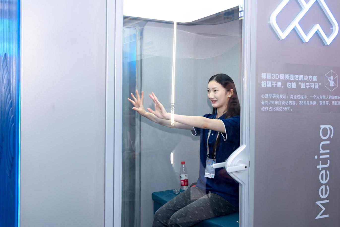 圖為參觀者體驗(yàn)騰訊會(huì)議裸眼3D通話(huà)艙