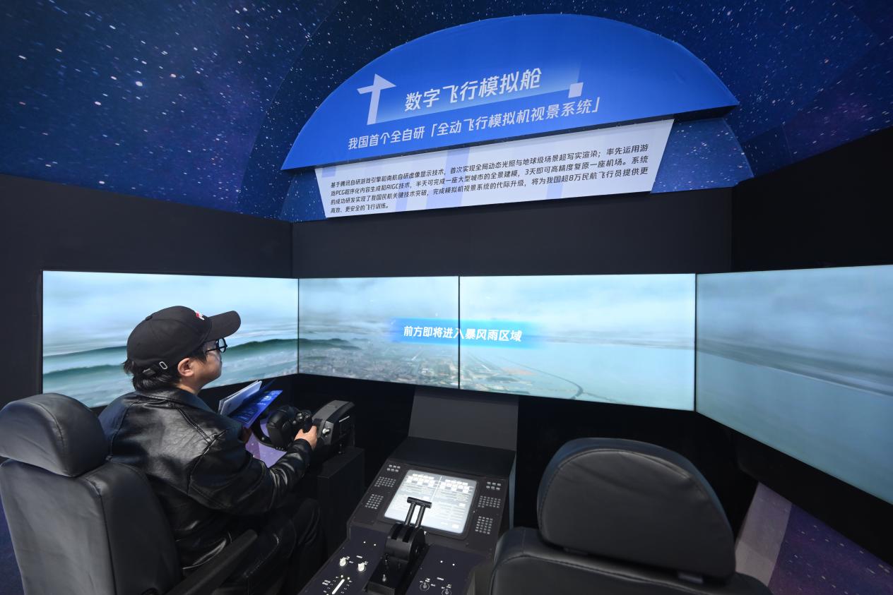 “只需要推動(dòng)操縱桿,就能操作系統(tǒng),體驗(yàn)民航飛行員第一視角下、擬真的訓(xùn)練場(chǎng)景……”在展區(qū)前方,由南航自研虛像顯示技術(shù)和騰訊自研游戲引擎技術(shù)共同打造的全動(dòng)飛行模擬機(jī)視景系統(tǒng),吸引眾多參觀者體驗(yàn)?;隍v訊自研游戲引擎,系統(tǒng)首次實(shí)現(xiàn)全局動(dòng)態(tài)光照與地球級(jí)場(chǎng)景超寫(xiě)實(shí)渲染,多邊形生成面數(shù)較之前提升380倍、貼圖精細(xì)度提升100倍,助力實(shí)現(xiàn)我國(guó)民航關(guān)鍵技術(shù)突破。