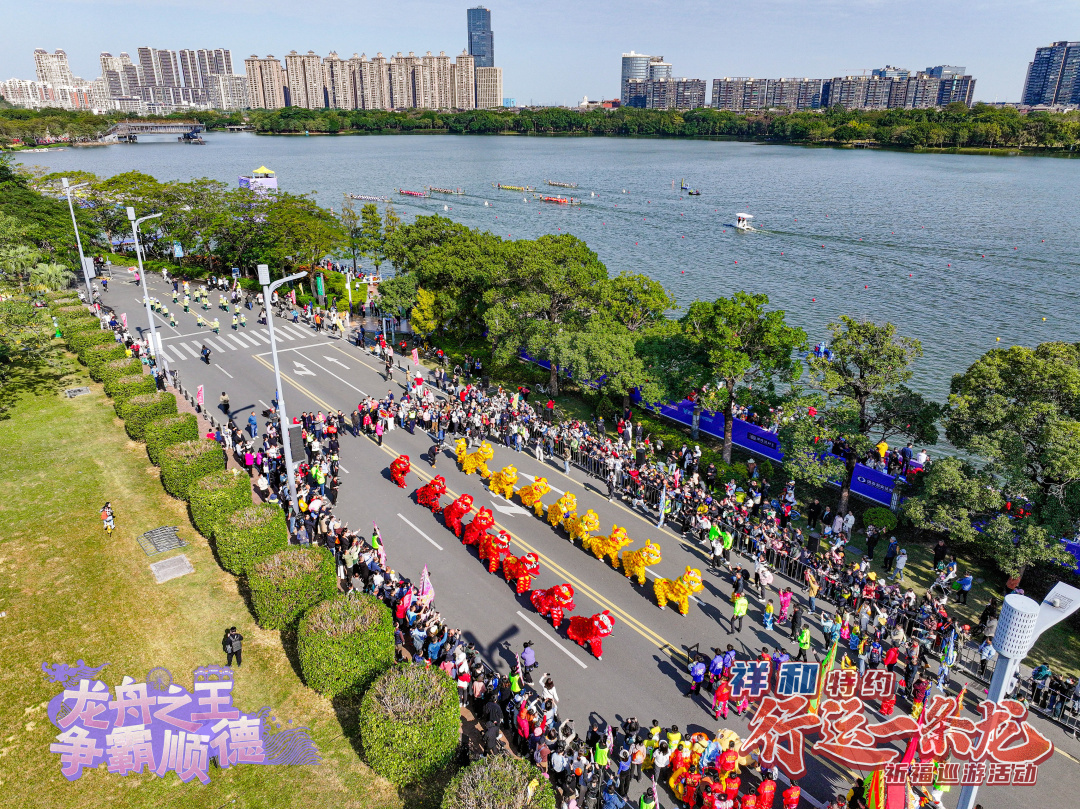 桂畔湖上觀競(jìng)渡,順峰山下接龍福。12月8日,陽光明媚,天朗氣清,水上,來自全國各地的龍舟勁旅齊聚順德,展開水上競(jìng)逐;岸邊,薈萃順德十鎮(zhèn)街龍文化元素的“文化巨龍”,開啟4.5公里的精彩巡游。