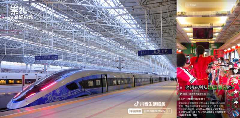 在線下,活動還聯(lián)動崇禮區(qū)政府、延邊州商務(wù)局、齊齊哈爾網(wǎng)信辦落地雪國專列,覆蓋復(fù)興號、民俗專列、高鐵站等不同場景,讓游客和市民感受濃濃冰雪氛圍,自發(fā)為當(dāng)?shù)匚穆梅N草,吸引更多雪友來到小城看見好風(fēng)光。截至活動收官,“開往崇禮站的雪國專列”熱度達827萬,一度登上抖音河北多地同城榜TOP1。