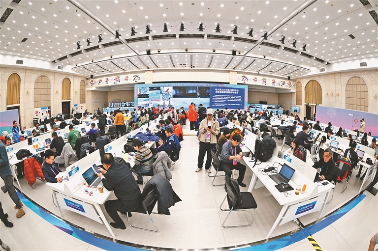 第九屆亞冬會(huì)主媒體中心(MPC)分為主新聞中心和國(guó)際廣播中心兩個(gè)部分,為注冊(cè)媒體記者和轉(zhuǎn)播商的工作提供保障服務(wù)。亞冬會(huì)開幕后,MPC里就坐滿了來哈爾濱采訪的各國(guó)記者,他們?cè)谶@里寫稿,向各地發(fā)送有關(guān)亞冬會(huì)的最新信息和比賽結(jié)果,他們也在這里相互交流,成為異國(guó)朋友。