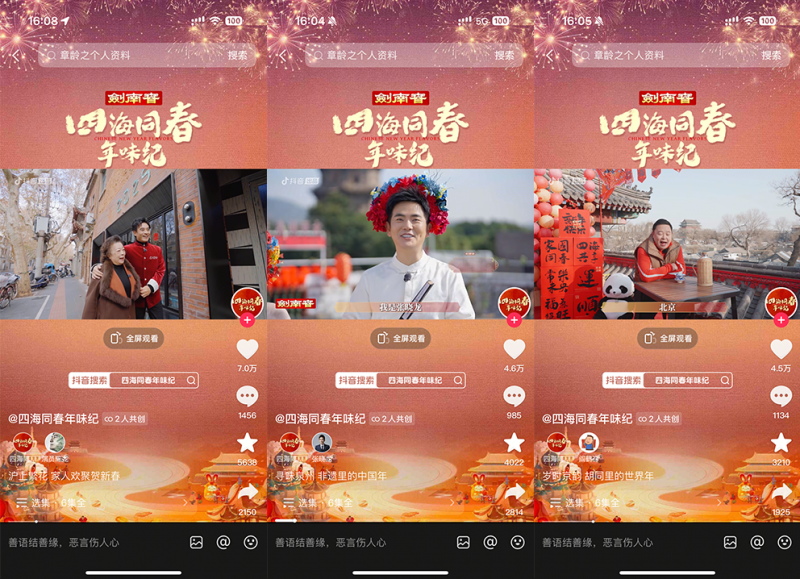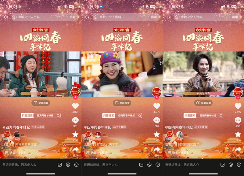 為紀(jì)念首個(gè)“非遺版春節(jié)”,由抖音出品、中國名酒劍南春冠名的春節(jié)主題紀(jì)錄片《四海同春年味紀(jì)》邀請(qǐng)多位明星來到家鄉(xiāng)或向往的城市,體驗(yàn)當(dāng)?shù)靥厣晡?。紀(jì)錄片于1月22日-1月27日,通過抖音、抖音精選、今日頭條、西瓜視頻、鮮時(shí)光等平臺(tái)播出。截至收官,該片正片播放量超1億,抖音話題播放量破2.3億,全網(wǎng)曝光達(dá)10億,相關(guān)話題多次登上平臺(tái)熱榜。