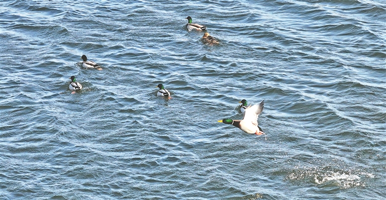 小野鴨融入湖中的一大群綠頭鴨,野鴨湖即將迎來(lái)春暖花開的季節(jié)。本報(bào)記者 張澍攝
